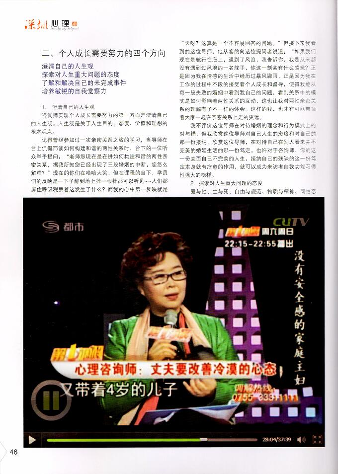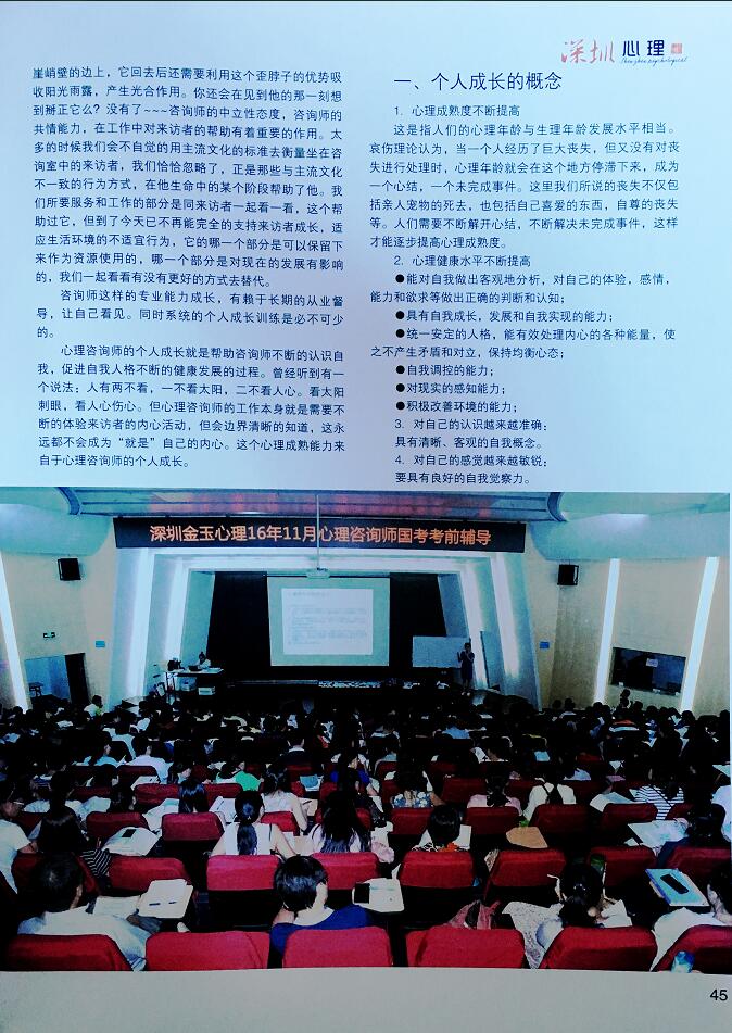 鉴于深圳市金玉心理咨询有限公司在心理咨询师培训领域中的领军地位,《深圳心理》杂志专门开辟了多视角专栏,以金玉心理培训取证后学员们的学后感言,来向同行传递心理咨询师培训过程中的教学理念,向每一位社会人士传递心理学对人们生活状态的积极影响。同时也让更多的人们寻找到一条让自己生活的幸福指数不断提升的成长之路。