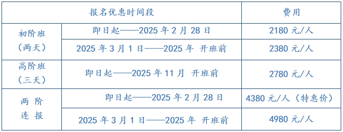 *开课前一个月内已结算完毕,参加课程的学员请确保能坚持参加全程培训,如因故中途退出,费用不予退还,也不设转班,敬请知悉!