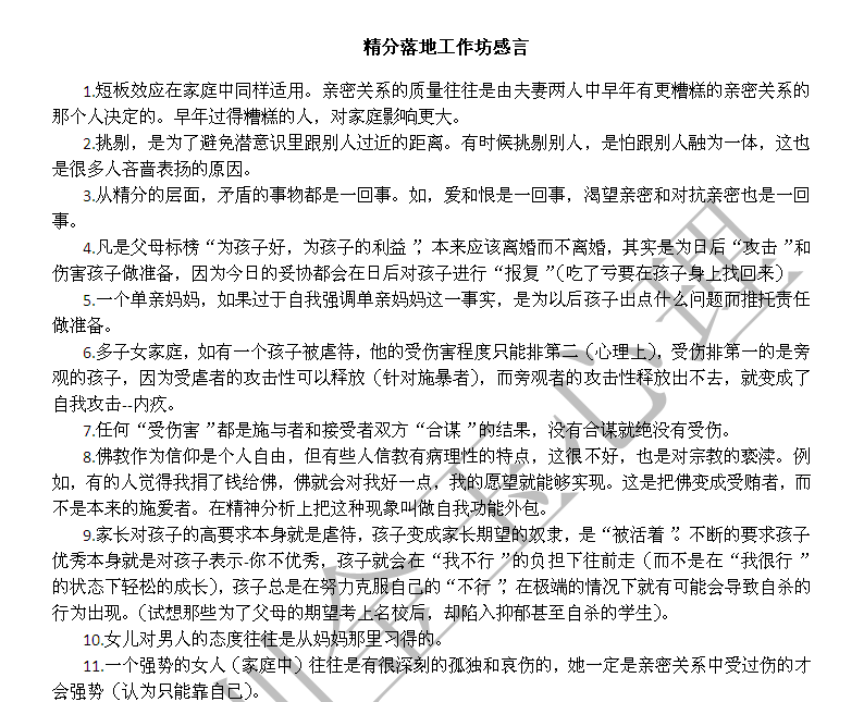 为期两天的精神分析工作坊在充满思考和探索的过程中愉快的结束了……四个个案的现场访谈,在曾奇峰导师抱持性的陪伴下,当事人在缓缓的道出自己的故事之后,情绪拥有了一次充分的释放过程。同时曾老师在每一个不被当事人觉察到的故事情节中,进行了充分的诠释:“你认为你是一个没有安全感的人,在我看来,你是很想攻击他们,但你又不想承认,所以你就投射性的认为是他们在攻击你,你听了我说这样的话,你的感觉是什么?”精神动力取向,让当事人在一次看似简单的提问中获得了改变的动力……。