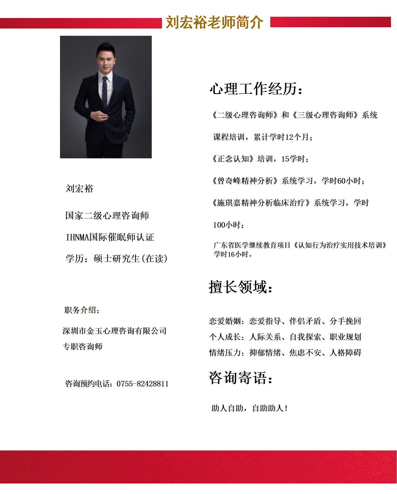 金玉心理咨询师刘宏裕老师简介