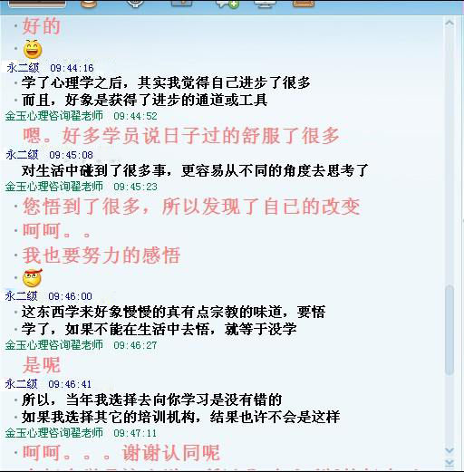 目前,金玉领导者为学员所想,除与企业联合创建了专业的心理援助工作站外,为了使学员能更多的学到实用性的心理学知识,实现“学为我所用”的办学目标,创办了每周的学习小组活动及系列的主题沙龙:婚姻与家庭漫谈、亲子关系构建、人来自脉络、沟通在人际关系中的运用。。。(金玉学员免费参加)。并于每周三做为心理咨询的公益项目,面向社会免费开放为获证并经过实习、考评合格的学员创造实际操作训练的平台,其它时段提供热线电话间接咨询的操作训练平台。后期也将与危机干预公益平台—春风网合作,面向社会服务,为学员取得证书后的实务训练奠定了基础。