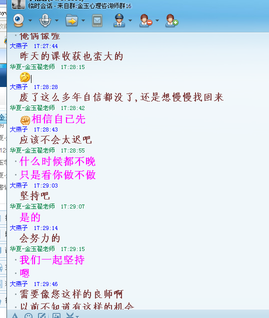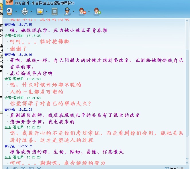 同时,面对学员们对企业培训领域的好奇及向往,近期金玉心理特为学员打造了“金玉心理讲师团”互练平台。在展示月的那些日子里,做为讲师的学员切身的体会到了为人师表的艰辛,同时又收获了为人师表的成就感和从未有过的自信体验。成长中的学员们更是将金玉当成了归属,下班后就匆匆赶来,享受这家园般免费的精神大餐。。。欢乐荡漾在每一位讲师和听众的笑语间。。。。